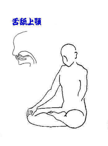 | @座布の上に座る。 *お尻を後ろに突き出すようにして座ります(背中を伸ばす必要はない)。 *足を組むもよし。組まないもよし。 *座布の前に立つまでの作法は省略します(坐禅の会などで作法が定められている場合は、それに従えばよいでしょう)。 A手のひらを下にして、自然な形で膝の上に置く。 *印を組む必要はありません。 B舌舐上顎(ぜっしじょうがく) *少しアゴを引いてちからを抜き(歯を食いしばらない)、舌先を上歯の裏(歯と歯茎のさかい)に軽くつけます。 C目は閉じても開いても良い。 *ただし力を入れないこと。 |