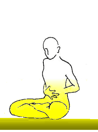 | 口から息を吐ききったら (無理をしてすべて吐ききる必要はありません) 会陰から息を吸い込むつもりで、 口から息を吸い込みます。 (なるべくゆっくり吸い込みましょう) 新しい大地のエネルギーを取り込むつもりで。 吸った息を下丹田にためるつもりで 下腹を前にふくらませていきます。 |