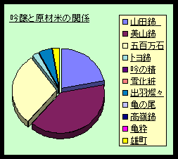 右のグラフは、大吟醸と原材米の関係をまとめたものです。こちらのグラフは明らかに全体図と違いが現れています。それは、山田錦の存在でしょう。書物を読みあさった時、山田錦は吟醸づくりに適している米であると記されていました。さらに、”山田錦に品種改良は必要なし”とまでといっている杜氏もいるようです。なぜそこまで言われているのかというと、山田錦は一粒が平均27〜28mgと大粒です。一般的な米は22〜23mgで有ることから、大粒といえるでしょう。この大粒のおかげで、精米しても壊れにくく、精米歩合35%にしても耐えられるのだそうです。また、でんぷんの塊である中心の心白が大きく、縦に割ると、心白が一文字に偏平に成っていて、吟醸づくりに不可欠な突きとハゼという麹が付きやすいのだそう。米自体も溶けにくく、低温でゆっくり溶けるため、これも吟醸づくりにも向いているというわけです。